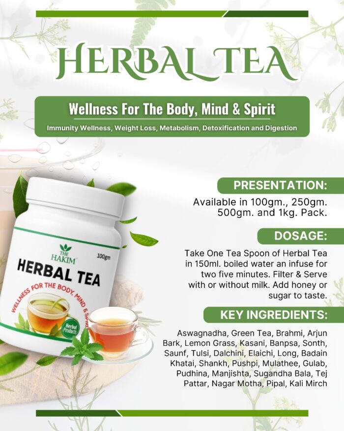 Experience the revitalizing touch of Ayurveda with “The Hakim Herbal Tea,” a meticulously crafted blend designed to support your overall well-being. This unique formulation combines 20 traditional Ayurvedic ingredients, each chosen for its inherent properties to help you feel your best, naturally.