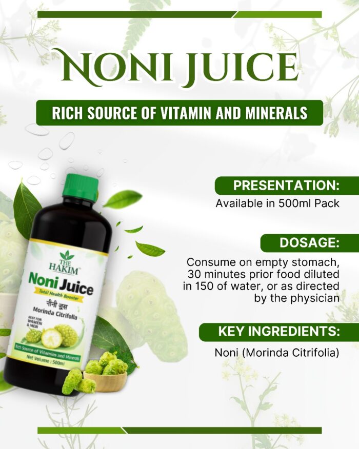 The Hakim Noni Juice is a powerful Ayurvedic health tonic made from 100% pure Morinda Citrifolia (Noni) fruit. Known for its rich antioxidant properties and immune-boosting benefits, this herbal juice is the perfect daily supplement for men and women seeking to improve their overall vitality, digestion, energy levels, and cellular health.